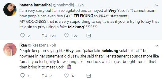 Vivy turut berkata, beliau tidak faham bagaimana seseorang boleh membeli telekung tiruan yang akan digunakan untuk menunaikan solat.