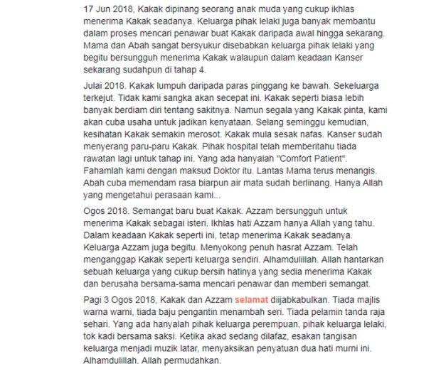 “Namun Allah lebih sayangkan Kakak dan saat itu tiba juga. Kakak pergi meninggalkan kami pada Subuh (Sabtu) 4 Ogos 2018. Alhamdulillah ditemani Mama, Abah, suaminya, Mak Besah serta saya,” menurut coretan abang pengantin perempuan, Shukur Yusuf di halaman Facebooknya pada Sabtu.