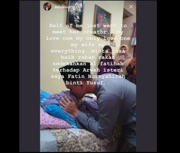 “Separuh jiwa saya menemui Penciptanya. Cinta saya, satu-satunya isteri yang saya cintai, segala-galanya buat saya,” katanya menerusi InstaStory, sambil meminta jasa baik rakan-rakannya untuk menyedekahkan al-fatihah kepada arwah isterinya.