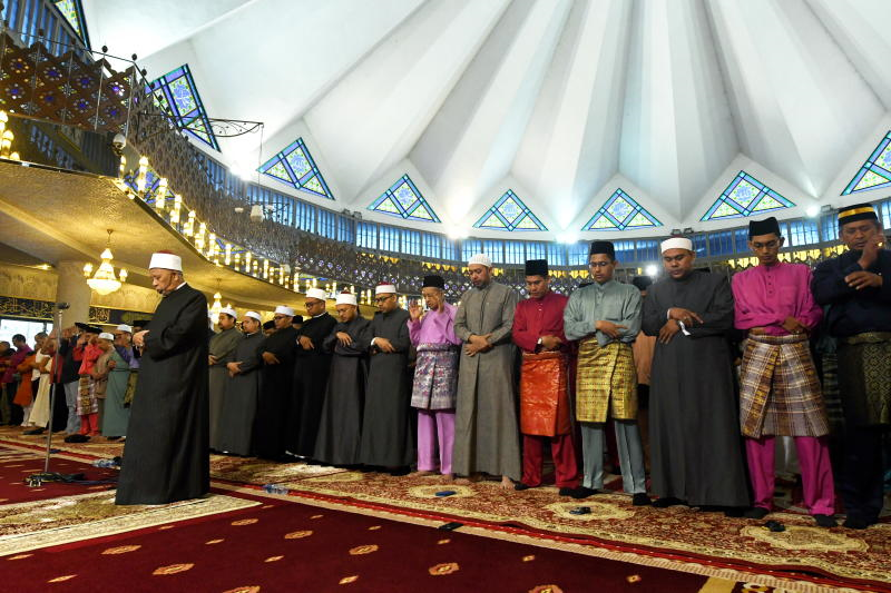 Tun M menunaikan solat Aidiladha yang diimamkan Iman Masjid Negara, Tan Sri Syaikh Ismail Muhammad. - fotoBERNAMA