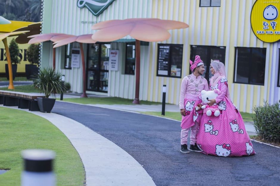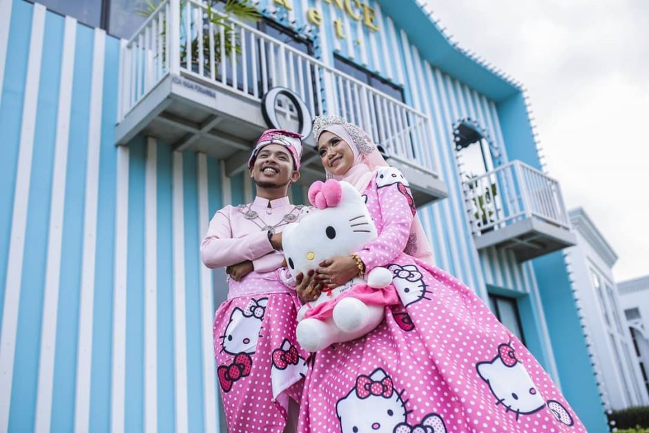 Latar belakang berwarna pastel menaikkan lagi seri busana pengantin 'Hello Kitty' yang digayakan pasangan ini.