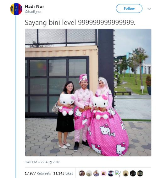 Ibarat pinang dibelah dua, pasangan pengantin Ismail Isahak dan Sakirah Md Zain tular di media sosial kerana berani menggayakan persalinan serba merah jambu dan bermotifkan 'Hello Kitty'.