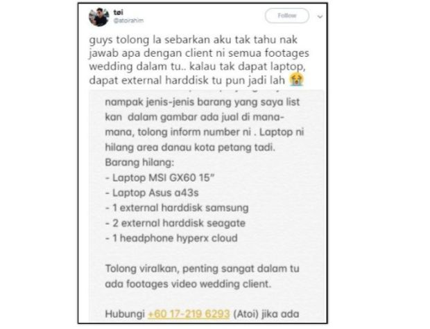 PETALING JAYA: Pernahkah anda bayangkan segala detik-detik manis majlis perkahwinan yang dirakam dalam bentuk foto dan video hilang tanpa jejak dan mungkin tidak akan ditemui kembali sampai bila-bila? Begitulah mimpi ngeri yang dihadapi seorang juruvideo apabila dua komputer riba dan tiga pemacu keras (hard disk) yang mengandungi rakaman majlis perkahwinan beberapa pelanggannya hilang pada Khamis petang. Ia bukan sahaja memberi kegusaran terhadap dirinya malah lebih teruk, dia juga harus memikirkan perasaan beberapa pasangan pengantin yang berharap untuk menatap semula visual hari bersejarah mereka tempoh hari. Bercerita kepada mStar Online, Ahmad Athoillah Abd Rahim, 26, mengakui terduduk dan mengalirkan air mata saat menyedari kehilangan barangan tersebut. "Masa tu sekitar 3 petang, saya tinggalkan barang tersebut dalam but kereta untuk ke kedai. Dalam masa 15 minit macam tu je. "Tapi saya sedar mengenai kehilangan barang itu sejurus tiba di kediaman saya di Shah Alam sekitar 5 petang. Memang rasa down gila, rasa macam jatuh teruk pada masa tu," ujarnya pada Jumaat. Paparan skrin tweet Atoi yang menerima lebih 4,000 ulang kicau (retweet). Dia yang mesra disapa dengan panggilan Atoi menganggarkan item-item tersebut bernilai lebih kurang RM5,000. Tambah Atoi, dia tidak kisah jika mereka yang mengambil barangan tersebut tidak mahu memulangkannya kembali kerana apa yang penting hanyalah rakaman majlis pelanggannya di dalam pemacu keras tersebut. "Ia melibatkan beberapa pasangan pengantin. Saya sudah hubungi dua orang, selebihnya saya akan hubungi selepas ini. "Namun tidaklah 100 peratus rakaman itu hilang sebab saya juga ada pembantu yang membuat rakaman menggunakan kamera mereka," katanya. Menerusi tweet yang dimuat naik pada Khamis, Atoi merayu kepada pengguna Twitter supaya menyebarkan maklumat mengenai kehilangan tersebut. Selain menyenaraikan beberapa item yang hilang, dia turut memaparkan nombor telefon miliknya bagi memudahkan orang ramai menyalurkan sebarang maklumat mengenai kehilangan tersebut. Ia ternyata mengundang simpati netizen dan menerima lebih 4,000 ulang kicau (Retweet). "Aku tak tahu nak cakap. Sebab aku pernah rasa benda ni. Bukan wedding tapi fashion and product. Allah nak bagi rezeki lebih. Hope everything gonna be ok," tulis @adhamtroese. "Oh gosh, hope you find back your stuffs (harap anda temui semula barangan yang hilang itu)," tulis seorang lagi pengguna Twitter. Dalam pada itu, sebagai solusi jika tidak berjaya mendapatkan semula rakaman tersebut, Atoi bersedia untuk membiayai rakaman semula (post wedding) untuk pelangganya. Jika mereka tidak bersetuju dengan tawaran tersebut, Atoi bakal membayar semula wang yang telah dilunaskan oleh pasangan pengantin terlibat sebelum ini. Atoi turut membuat laporan polis sejurus menyedari kehilangan itu dan berpesan agar juruvideo serta jurufoto di luar sana lebih berhati-hati agar tidak mengalami nasib sepertinya.