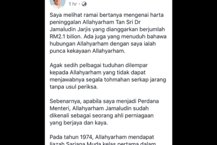 “Saya melihat ramai bertanya mengenai harta peninggalan Allahyarham Tan Sri Dr Jamaludin Jarjis yang dianggarkan berjumlah RM2.1 bilion. Ada juga yang menuduh bahawa hubungan Allahyarham dengan saya ialah punca kekayaan Allahyarham.
