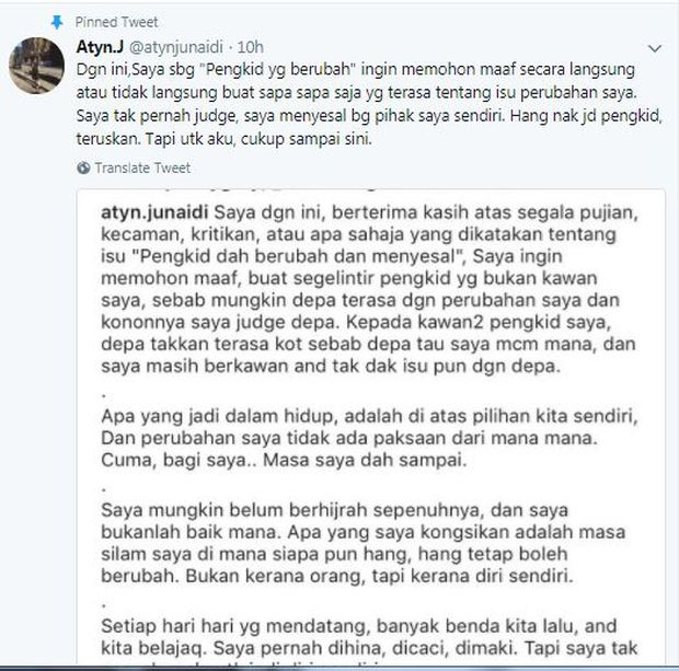 "Dengan ini, saya sebagai "pengkid yang berubah" ingin memohon maaf secara langsung atau tidak langsung buat siapa-siapa sahaja yang terasa tentang isu perubahan saya.