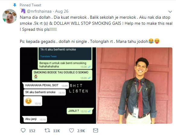 Terdahulu tweet rakan kepada Dollah @nrfrshainaa yang berbunyi:"Nama dia Dollah. Dia kuat merokok. Balik sekolah je merokok. Aku nak stop smoke. 5k rt (s) & Dollah will stop smoking gais! Help me to make this real! Spread this pls!!!" menjadi tular.