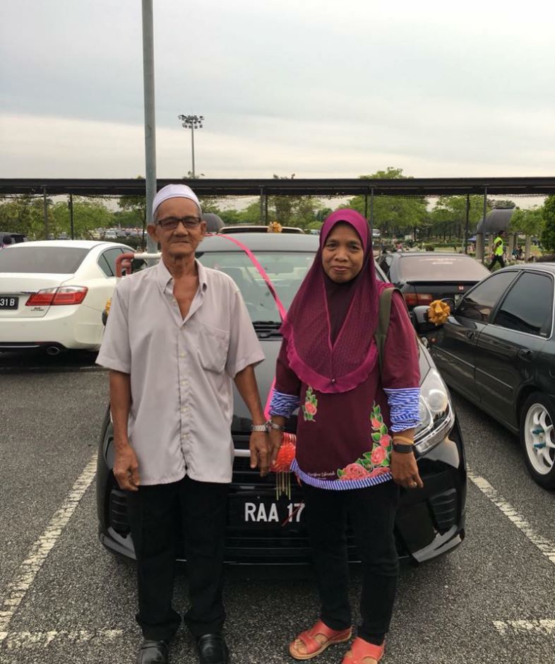Mohd Tawil dan isteri berdiri di hadapan kereta baharu yang dihadiahkan oleh anak-anak mereka.