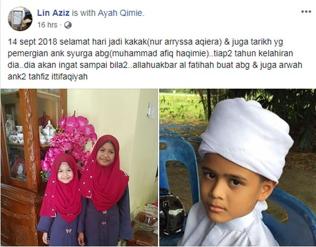 “Tiap-tiap tahun kelahiran dia (Nur Arryssa)... dia akan ingat sampai bila-bila. Allahuakbar, Al-Fatihah buat Abang dan juga arwah anak-anak tahfiz Ittifaqiyah,” kata Norazlin menerusi halaman facebooknya, awal pagi Jumaat.