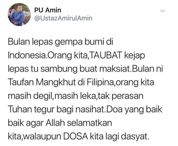 “Bulan lepas gempa bumi di Indonesia. Orang kita, taubat kejap lepas tu sambung buat maksiat. Bulan ni Taufan Mangkhut di Filipina, orang kita masih degil, masih leka, tak perasan Tuhan tegur bagi nasihat. Doa yang baik-baik agar Allah selamatkan kita, walaupun dosa kita lagi dahsyat,” tulisnya, Isnin.