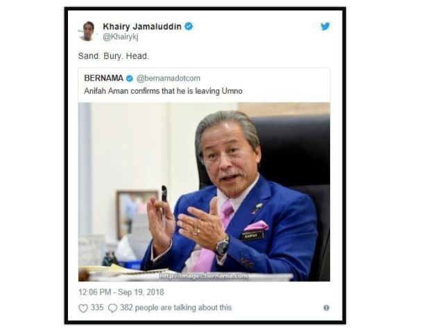 PETALING JAYA: Khairy Jamaluddin menjadi antara ahli Umno yang terawal memberi reaksi berhubung pengunduran Datuk Seri Anifah Aman dari parti itu.