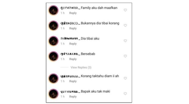 "Family aku dah maafkan. Bukannya tibai korang. Dia tibai aku bersebab. Korang tak tahu diam-diam lah," tulisnya di ruangan komen.