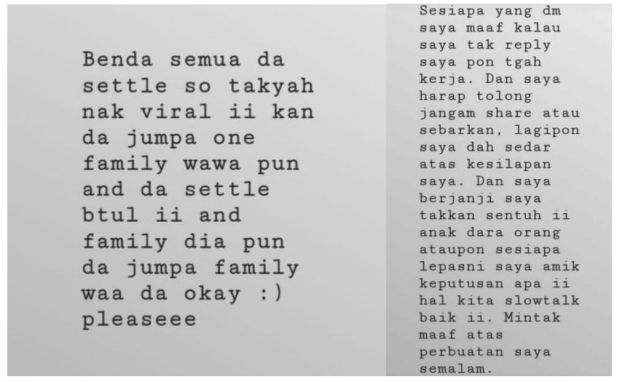 Susulan 'siasatan' itu, lelaki dalam video berkenaan memuat naik permohonan maaf di Instagram miliknya dan menjelaskan perkara sebenar yang berlaku antara dia dan kekasihnya.