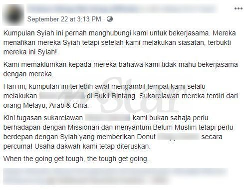 "Semasa kami bagi 1,000 donat, tiada seorang pun individu yang marah atau tanya soalan kepada kami, tapi selepas F****** W*** (pendakwah) mengeluarkan kenyataan itu, terus bantai cakap kami ni Syiah," katanya ketika dihubungi pada Rabu.
