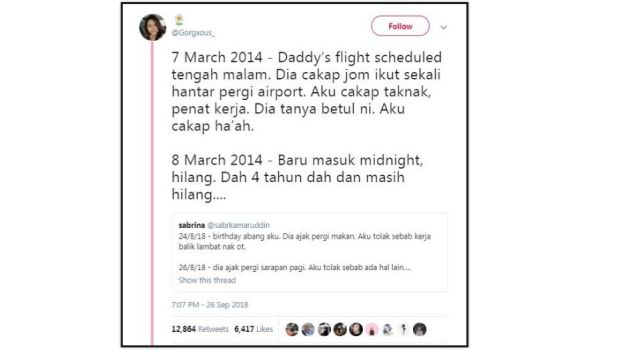 ARTIKEL BERKAITAN:Anak Perempuan Ketua Pramugara MH370 Luah Rasa Sedih Di Twitter