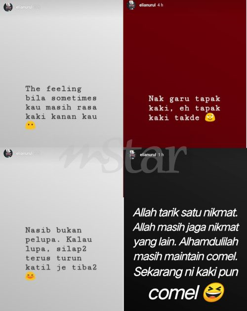 “Tapi saya cuba berfikiran positif, buat apa nak meratap nak meraung pun. Bukannya boleh tumbuh balik kaki tu. Saya harus tabah dengan ketentuan Allah,” kata anak kelahiran Ampang, Selangor ini kepada mStar Online.