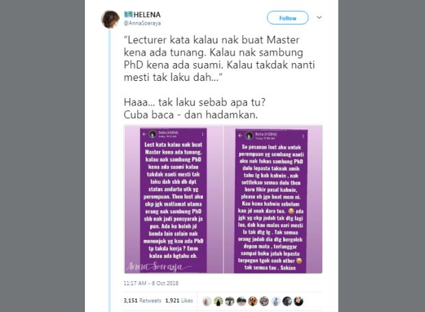 "Fokus lecturer tu hanya pada perempuan pula tu. Kenapa tak mention lelaki yang sambung belajar dan tak kahwin juga ya?," soalnya.