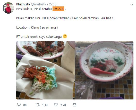 PETALING JAYA: Zaman sekarang, apakah menu tengah hari yang boleh dibeli dengan harga RM2.90? Mungkin boleh dapat secawan teh dan sebungkus nasi lemak. Tetapi jangan pula terkejut kerana gerai dekat Taman Sri Kapar, Klang menawarkan sebungkus nasi kukus atau nasi kerabu serendah RM2.90 sahaja! Harga minuman pula hanya RM1. Bukan itu sahaja, pelanggan yang makan di gerai itu juga boleh tambah nasi dan air tanpa caj tambahan. Antara pilihan air yang ada di gerai Nasi Kukus RM2.90 adalah air jagung, cincau selasih dan kelapa. Peniaga, Nur Izzah Izzati Norazlan (gambar) , 18, berkata, sebelum ini nasi kukus di situ berharga RM4, tetapi diturunkan kepada RM2.90 sejak dua minggu lalu oleh bapanya, Norazlan Mokhri, 45. Dia menambah, sepanjang 10 tahun lalu bapanya berniaga pisang goreng dan kuih-muih di situ, tetapi mula menjual nasi kukus dan nasi kerabu sejak lima tahun lepas sebagai menu sampingan. "Abah cakap berniaga sambil sedekah akan lagi murah rezeki. "Kalau nak cakap jual murah macam ni pulang modal ke tak, sebenarnya sama je kalau kita jual mahal, lepas tu tak laku," katanya ketika dihubungi mStar Online pada Rabu. Tambah anak bongsu daripada dua beradik itu, keluarganya tetap mendapat keuntungan walaupun menjual pada harga murah apabila lebih ramai pelanggan yang datang membeli. Antara lauk yang diberikan untuk nasi kerabu adalah ayam berempah, sayur, budu, dan kerisik; sementara nasi kukus pula ada timun, ayam atau ikan keli. Nasi kerabu (kiri) dan nasi kukus (kanan) dijual pada harga RM2.90 sahaja. Nur Izzah Izzati yang mengiklankan jualan nasi kerabu dan nasi kukus di Twitter sejak Jumaat lalu itu terkejut apabila jumlah pelanggannya meningkat berkali ganda. "Kami memang berterima kasih dengan orang yang RT (ulang kicau) di Twitter dan bagi komen yang positif. "Dulu pukul 3 petang baru habis berniaga, sekarang pukul 1 tengah hari sudah lesap semua, pagi-pagi dah penuh orang datang," ujarnya. Menurut Nur Izzah Izzati, sebelum ini, bapanya menggunakan tujuh ekor ayam sehari, namun kadang-kadang lauk yang dimasak tidak habis walaupun sudah pukul 3 petang. Selepas postingnya di Twitter itu tular, bapanya perlu memasak sebanyak 20 ekor ayam sehari dan semuanya habis dijual menjelang pukul 1 petang.