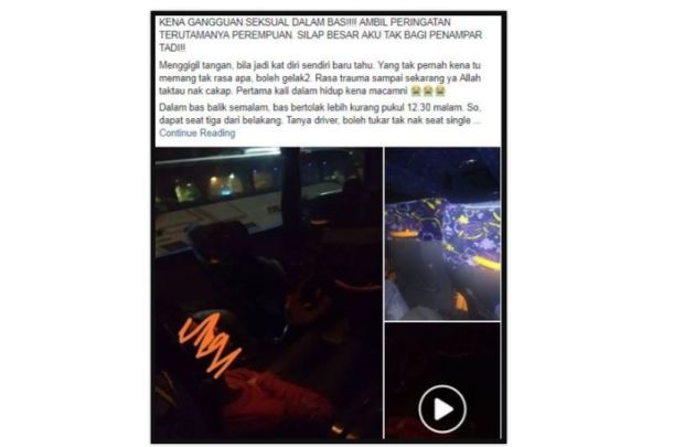 Menerusi satu posting yang ditularkan di laman Facebook, seorang wanita berkongsi kisahnya yang hampir dicabul dalam sebuah bas baru-baru ini.