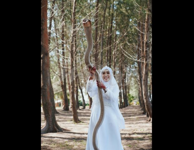Bagi pasangan dari pantai timur, Che Ku Najihah Farhana Che Ku Zakaria, 23, dan Kamaruzaman Romaino, 31, mereka memilih untuk menggunakan dua ekor tedung selar (King Cobra), tiga ekor ular sawa dan seekor ular boa sebagai prop untuk sesi penggambaran mereka.