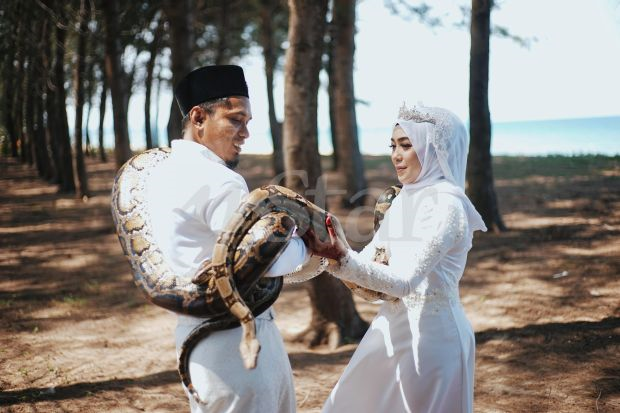 Tiga ekor ular sawa turut dijadikan prop untuk sesi penggambaran pasangan ini. - foto ihsan Mohd Taqiuddin Iqbal Razali