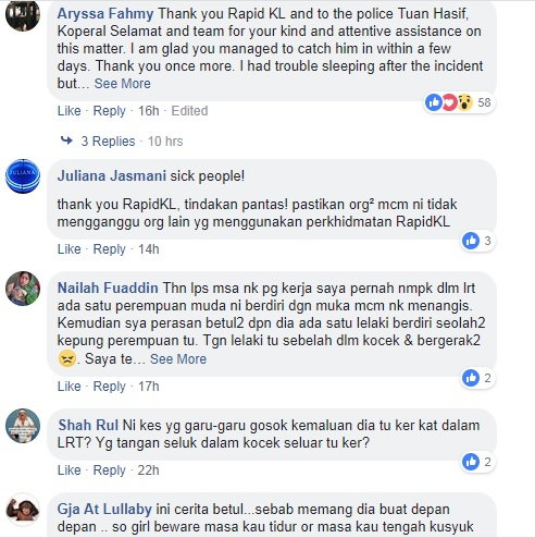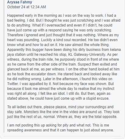 Rabu lalu, seorang pengguna Facebook Aryssa Fahmi berkongsi berkongsi pengalaman buruk ketika berada di dalam tren apabila berada berdekatan dengan lelaki itu.