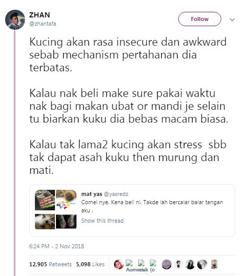 "Apabila dipotong tak beri kesan pun kepada keupayaan kucing. Sebab kuku itu boleh tumbuh semula macam kuku manusia," katanya.