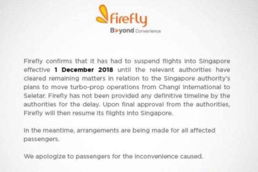 SINGAPURA: Syarikat penerbangan Firefly akan menggantung semua penerbangan ke Singapura berkuat kuasa dari 1 Disember, hari ia dijadualkan untuk berpindah operasi dari Lapangan Terbang Changi ke Lapangan Terbang Seletar. Menerusi notis di laman webnya, menurut syarikat penerbangan itu, ia menyambung operasinya sebaik pihak berkuasa berkaitan menyelesaikan isu pengawalseliaan berhubung pemindahannya ke Seletar. Firefly, anak syarikat Malaysia Airlines, tidak mengulas lanjut mengenai keputusannya menggantung penerbangan berkenaan, tetapi The Straits Times difahamkan ia dalam rundingan dengan Pihak Berkuasa Penerbangan Awam Malaysia (CAAM). "Firefly mengesahkan ia menggantung penerbangan ke Singapura, berkuat kuasa 1 Disember 2018 sehingga pihak berkuasa menyelesaikan perkara berkaitan dengan rancangan pihak berkuasa Singapura untuk memindahkan operasi pesawat turbo-prop dari Lapangan Terbang Antarabangsa Changi ke Seletar," menurut syarikat penerbangan dalam notis tersebut. Rancangan itu untuk Fireflt berpindah ke terminal penumpang yang dibuka pada Isnin lalu, bagi penerbangan komersial berjadual dan bisnes penerbangan membabitkan penumpang yang menggunakan penerbangan bisnes carter dan jet peribadi. Changi Airport Group, yang mengumumkan pembukaan itu berkata, semua operasi pesawat turbo-prop di Changi akan berpindah ke terminal Lapangan Terbang Seletar dari 1 Disember. Pengendali lapangan terbang itu memberitahu, Lapangan Terbang Seletar turut mengendalikan penerbangan turbo-prop berjadual di Singapura bermula dari hari berkenaan. Pada masa ini, hanya Firefly yang mengendalikan penerbangan turbo-prop ke Changi. Ia menawarkan 20 penerbangan harian - ke dan dari Subang, Ipoh dan Kuantan. Menerusi notis tersebut, tambah syarikat penerbangan itu: "Firefly tidak diberikan tempoh yang tetap oleh pihak berkuasa di atas penangguhan itu. Firefly akan menyambung semula operasi penerbangan ke Singapura selepas mendapat kelulusan yang muktamad daripada pihak berkuasa. "Pada masa ini, urusan dilakukan untuk semua penumpang yang terjejas. Kami memohon maaf kepada para penumpang di atas kesulitan," menurut kenyataan itu. – The Straits Times/Asia News Network