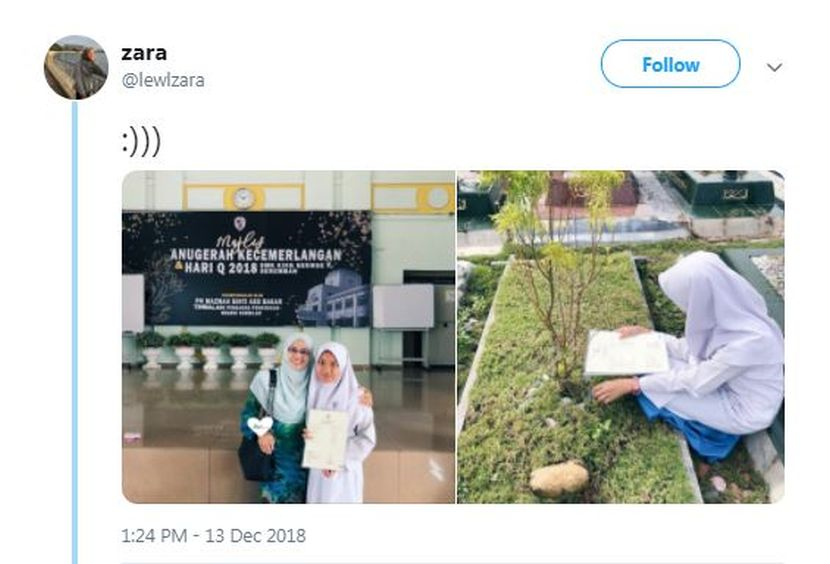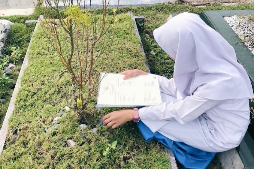 "Setelah ambil keputusan PT3, saya terus ke kubur arwah ayah bersama ibu, tapi setiap hari nak pergi sekolah pun memang akan lalu tapak perkuburan tu.