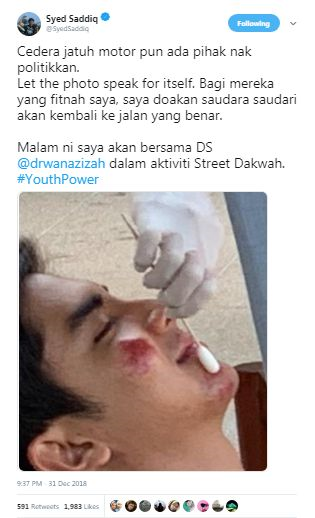 PETALING JAYA: Ketua Angkatan Bersatu Anak Muda (ARMADA), Syed Saddiq Syed Abdul Rahman kecewa selepas difitnah berpura-pura 'sakit' ketika menghadiri Persidangan Agung Tahunan Bersatu 2018 pada Sabtu lalu. "Cedera jatuh motor pun ada pihak nak politikkan. Biarlah gambar berbicara. "Bagi mereka yang fitnah saya, saya doakan saudara saudari akan kembali ke jalan yang benar," katanya dalam satu posting di Twitter. Syed Saddiq turut memuat naik bersama gambar lukanya di pipi dan dagu yang sedang dibersihkan. Terdahulu, selepas kedudukan balutan di pipi Syed Saddiq dipertikaikan, kini gelagat Menteri Belia dan Sukan itu yang berjalan terhincut-hincut di hadapan lensa wartawan pula dipersoalkan. Malah ada pihak yang menuduhnya berlakon di hadapan media. Dalam video yang tersebar, ahli Parlimen Muar itu bersalaman dengan beberapa individu sebaik turun dari kereta dan dilihat berjalan secara normal. Syed Saddiq dalam postingnya di Twitter menafikan beliau berpura-pura sakit. Namun ketika media menghampirinya, Syed Saddiq dilihat tiba-tiba berjalan terhincut-hincut. Gelagatnya itu menjadi perbualan hangat di media sosial terutama dalam kalangan penyokong pembangkang. Pada malam Jumaat lalu, Syed Saddiq dilihat memakai balutan di pipi dan dagunya pada Perhimpunan Agung Bersatu 2018. Ketika ditanya apa yang berlaku kepada dirinya, Syed Saddiq berkata dia jatuh dari motosikal. "Saya jatuh daripada motosikal tiga hari lalu, saya harap saya akan pulih dalam tempoh satu atau dua minggu. "Saya pergi melakukan pemeriksaan kedua di hospital hari ini (Jumaat) kerana hidung saya masih berdarah, saya akan mendapat laporan penuh pada Isnin selepas hospital melakukan imbasan penuh. "Ia adalah cerita panjang tetapi yang paling penting adalah kita semua berada di sini dengan battle scars (parut pertempuran) masing-masing - sama ada secara mental atau fizikal," kata Syed Saddiq. Semasa baru sampai..elok jer @SyedSaddiq berjalan, mcm tak ada apa2.. bila dihadapan wartawan, terus berjalan terhincut-hincut..hebat betul lakonan bro.. pic.twitter.com/itF98k65hN — Langkasuka ?? (@Mikhail_E17) December 29, 2018