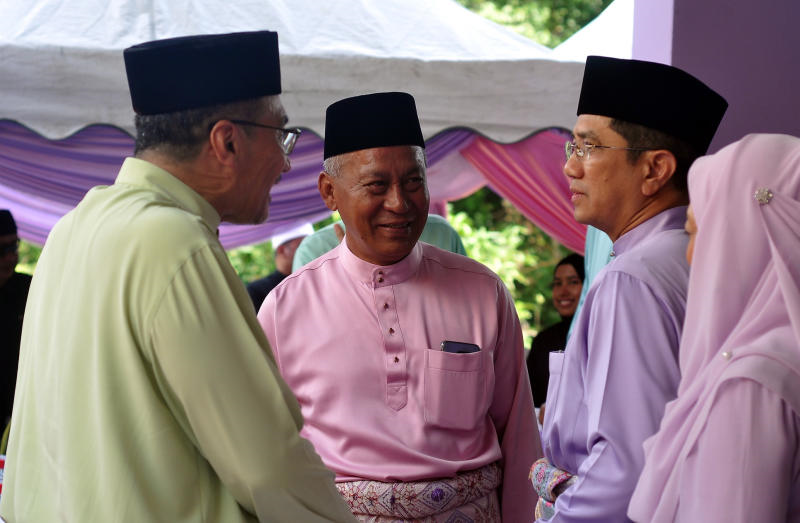 Hishammuddin (kiri) dan Mohamed Azmin (dua dari kanan) dirakam ketika menghadiri majlis perkahwinan yang dianjurkan oleh Datuk Seri Shahiruddin Ab Moin (tengah).