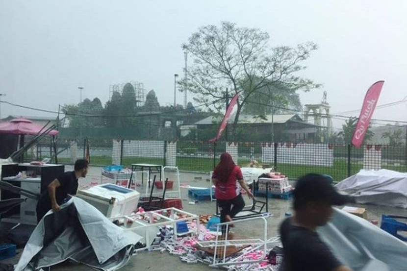 "Semalam hujan lebat dan tiba-tiba angin kuat sehinggakan khemah di gudang roboh dan menghempap barang jualan.