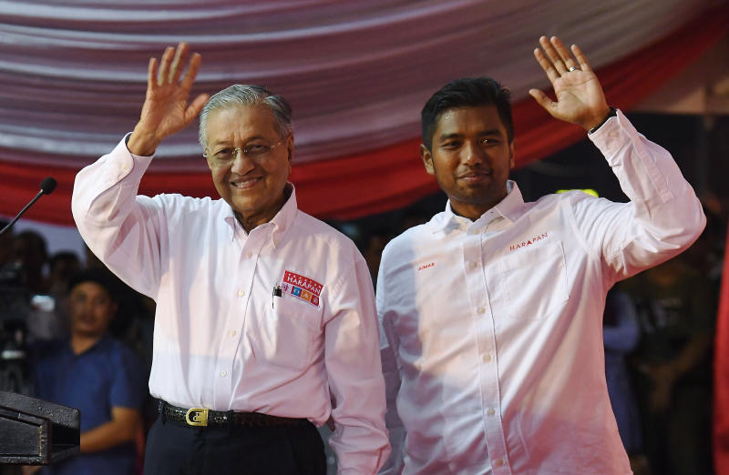 Dr Mahathir dan calon Pakatan Harapan N24 Semenyih Muhammad Aiman Zainali melambaikan tangan kepada orang ramai pada Ceramah Perdana Pakatan Harapan sempena Pilihanraya Kecil N24 Semenyih. - Foto Bernama