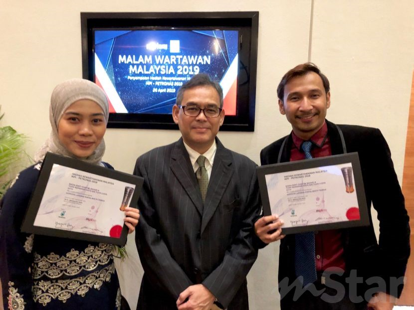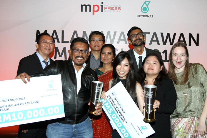 Wartawan Lee Chonghui dan pereka grafik Zulhaimi Baharuddin masing-masing merangkul Hadiah Wartawan Muda A. Samad Said dan Desain Halaman Pertama Terbaik.