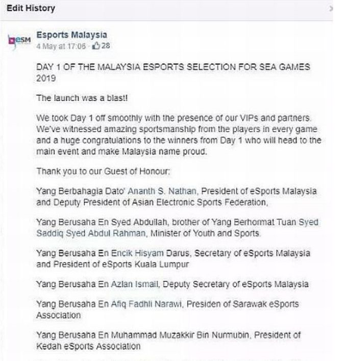 “Namun kehadiran beliau adalah di atas kapasiti peribadi sebagai peminat dan penyokong kepada pembangunan industri sukan elektronik," ujar ESM dalam satu posting di Facebook lewat Isnin malam.