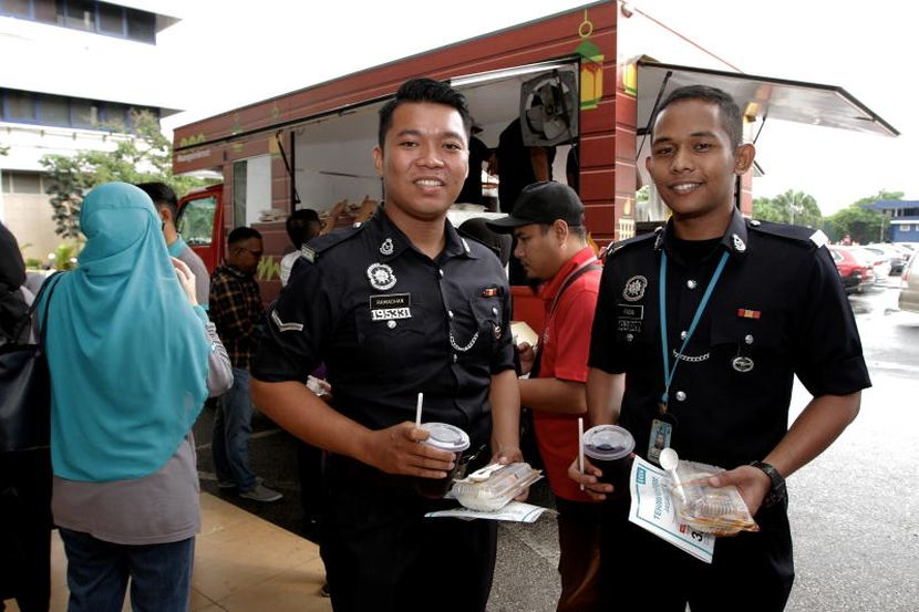 Jay Khairil (kiri) menyampaikan sumbangan juadah berbuka puasa kepada warga kerja IPK Kuala Lumpur. Foto YAP CHEE HONG