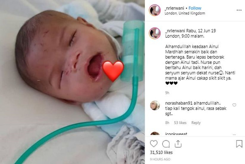 Ibu Ainul turut berkongsi berita gembira mengenai keadaan anaknya di Instagram.