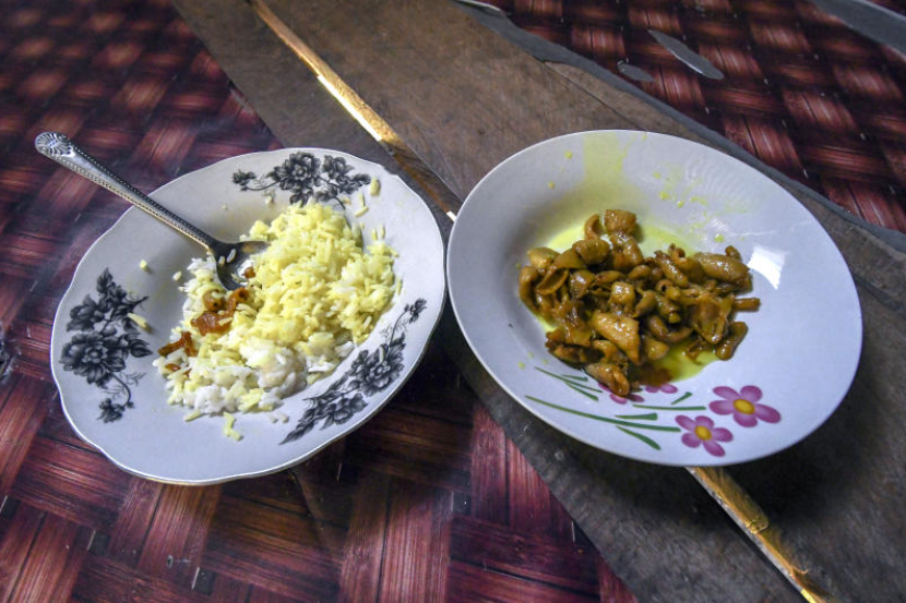 Beginilah hidangan yang dimakan keluarga Siti Hamidah Abdul Aziz, 32, bersama suaminya Mohd Zuhaidi Shafin, 33, dan anak-anak... sekadar kulit ayam goreng dengan nasi kosong diambil dari kantin sebuah sekolah berhampiran rumahnya di Kampung Tengah, Kuala Krai. -foto Bernama