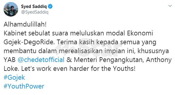 “Alhamdulillah! Kabinet sebulat suara meluluskan modal Ekonomi GoJek-DegoRide. Terima kasih kepada semua yang membantu dalam merealisasikan impian ini, khususnya Perdana Menteri, Tun Dr Mahathir Mohamad dan Menteri Pengangkutan, Anthony Loke. Marilah berusaha malah lebih gigih untuk belia!,” tulisnya di laman sosial Twitter miliknya, petang Rabu.