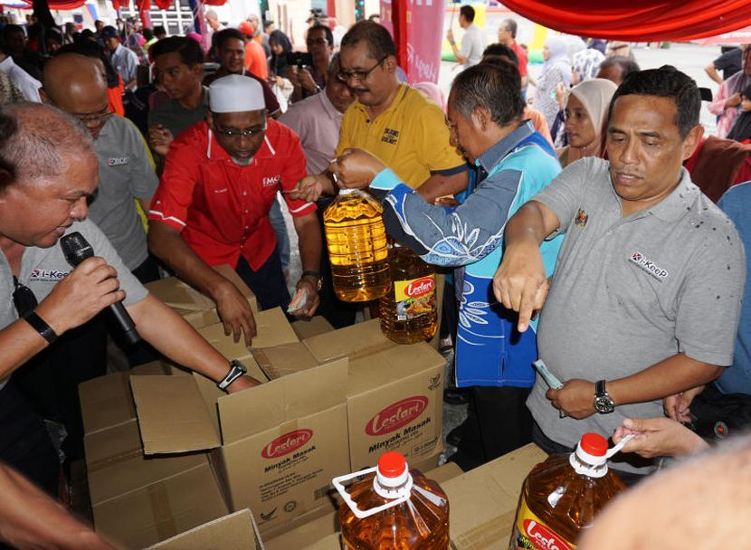 Muez (kanan) membantu menjual minyak masak lima kilogram yang dijual pada harga RM10 berbanding harga asal RM16.99 pada sesi 'happy hour' Karnival Jualan i-KeeP 'Pulun Belanja' di Dataran Sungai Kuah, Langkawi pada 15 November lalu. Foto Bernama