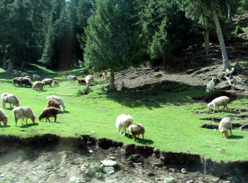 Haiwan meragut di padang rumput di kawasan pergunungan Tian Shan, Wilayah Autonomi Xinjiang Uyghur.