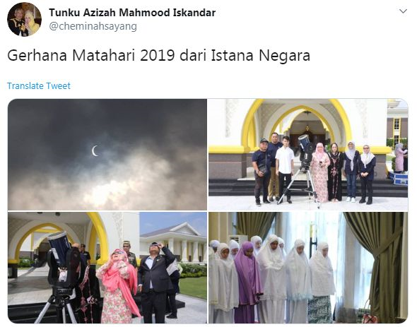 MEDIA sosial seperti Instagram, Facebook dan Twitter tentu dipenuhi dengan foto gerhana anulus. Pastinya ramai yang tidak mahu ketinggalan berkongsi foto fenomena yang menjengah langit seluruh dunia termasuk Malaysia, di media sosial masing-masing. ARTIKEL BERKAITAN: “Saya janji akan pergi bila ke sana lagi” - Tunku Azizah terkilan tak dapat singgah gerai durian Rafi Ini termasuklah Raja Permaisuri Agong (RPA), Tunku Azizah Aminah Maimunah Iskandariah yang berkongsi foto fenomena berkenaan di laman Twitter rasmi milik baginda. Tunku Azizah turut memuat naik beberapa keping gambar baginda bersama anakandanya melihat fenomena tersebut di perkarangan Istana Negara. Tunku Azizah menyaksikan fenomena gerhana matahari bersama anakanda baginda di perkarangan istana. Permaisuri itu juga turut memuat naik gambar baginda menunaikan solat sunat. Fenomena gerhana anulus dapat dilihat di langit Malaysia pada Khamis selepas tempoh 21 tahun. Fenomena alam ‘cincin berapi’ itu boleh dapat dilihat bermula pukul 11 pagi Khamis dan akan berlangsung sehingga kira-kira pukul 3 petang. Tunku Azizah memuat naik beberapa keping gambar di Twitter rasmi milik baginda. Kali terakhir ia dilihat di langit Malaysia adalah pada 22 Ogos 1998 di Mersing, Johor. Gerhana tersebut berlaku apabila bulan bergerak tepat di hadapan matahari tetapi disebabkan pada ketika itu, bulan berada agak jauh daripada bumi, maka saiznya sedikit kecil dan tidak akan dapat menutupi keseluruhan bentuk piring matahari. Fenomena gerhana anulus dapat dilihat di langit Malaysia pada Khamis selepas tempoh 21 tahun. Fenomena ini dapat disaksikan di Serian, kira-kira 60 kilometer dari Bandar Raya Kuching.Selain Serian, Tanjung Piai di Johor turut mengalami fenomena gerhana matahari anulus.