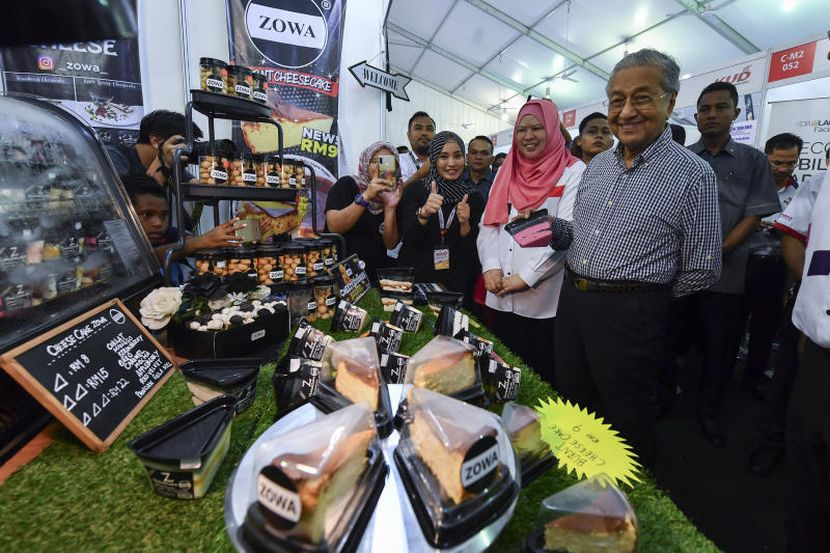 Dr Mahathir melihat kek keju di gerai Zowa Cheese Cake semasa melawat tapak Karnival Usahawan Desa (KUD) Putrajaya 2019 di Presint 3, Putrajaya pada 19 Oktober lalu. Turut hadir, Rina. Foto Bernama
