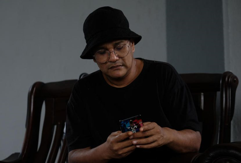 Azahari sugul ketika membalas pesanan ringkas dalam temubual di rumahnya di Kubang Buaya di Kuantan, mengenai anak saudaranya Mohammad Farhan Fudhail. Foto Bernama