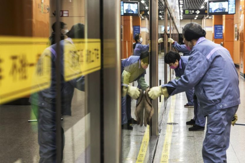 Kerja-kerja pembersihan dilakukan di stesen kereta api di Shanghai. -foto Bloomberg