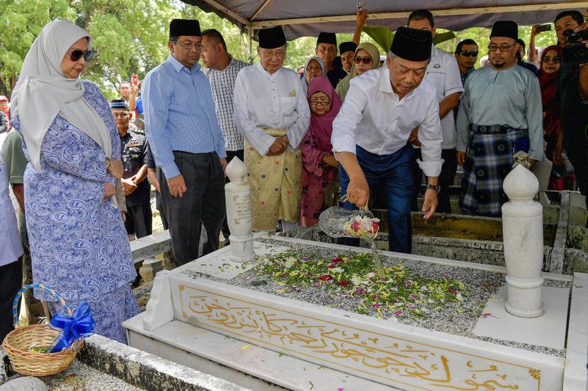 Muhyiddin menyiram air mawar ketika menziarahi pusara ibu dan bapanya, Khadijah Kasim dan Muhammad Yassin Mohamad di Tanah Perkuburan Islam Bakri Batu 1. Turut hadir isterinya, Puan Sri Noorainee Abdul Rahman (kiri) dan abangnya, Tan Sri Abdul Aziz Yassin. Foto Bernama