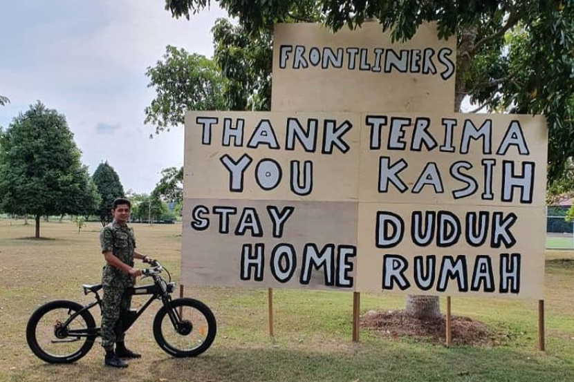 Dengan mengenakan seragam tentera, Tengku Hassanal memulakan rakaman video itu dengan berdiri di hadapan 'papan tanda' buatan sendiri yang tertera perkataan 'Frontliners', 'Thank You', 'Stay Home', 'Terima Kasih' dan 'Duduk Rumah'.