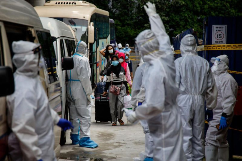 Petugas KKM yang lengkap memakai pakaian pelindung diri (PPE) dan dibantu anggota Polis Diraja Malaysia (PDRM) berada di kawasan tapak pembinaan bagi membawa keluar warga asing untuk dibawa ke pusat kuarantin ketika tinjauan di sekitar Kuala Lumpur pada Selasa. - fotoBernama