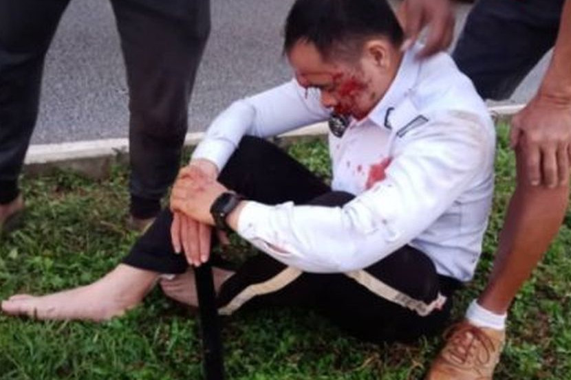 Seorang anggota polis yang sedang mengawal lalu lintas cedera di muka selepas dilanggar sebuah kereta yang hilang kawalan. Foto: THE STAR