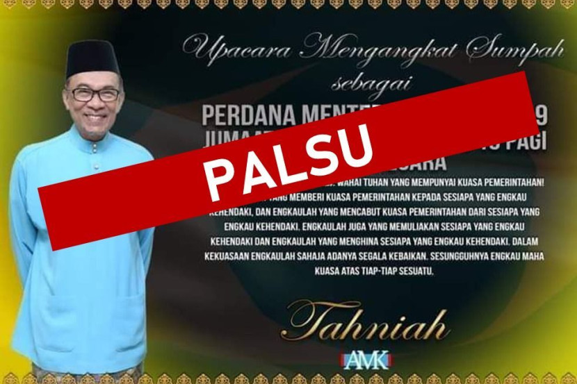 SEKEPING poster ucapan tahniah berhubung majlis angkat sumpah Datuk Seri Anwar Ibrahim sebagai perdana menteri kesembilan disahkan palsu. Menurut setiausaha Angkatan Muda Keadilan (AMK), Ahmad Syukir Razab, logo yang digunakan dalam poster berkenaan juga disahkan palsu. ARTIKEL BERKAITAN: “Ini bukan kerajaan pintu belakang” - Anwar umum peroleh majoriti kukuh ahli parlimen, layak jadi PM "AMK menggesa semua pihak untuk tidak berkongsi poster yang mungkin dibuat oleh pihak yang tidak bertanggungjawab untuk mengganggu proses peralihan Kerajaan Persekutuan yang sedang berlangsung," ujarnya menerusi satu kenyataan pada Khamis. Menerusi keterangan poster itu, Anwar didakwa akan mengangkat sumpah di Istana Negara pada 10 pagi, Ahad. Anwar pada Rabu menerusi sidang media tergempar mendakwa memperoleh majoriti kukuh untuk membentuk sebuah kerajaan baharu. - The Star. Nak macam-macam info? Join grup Telegram mStar!