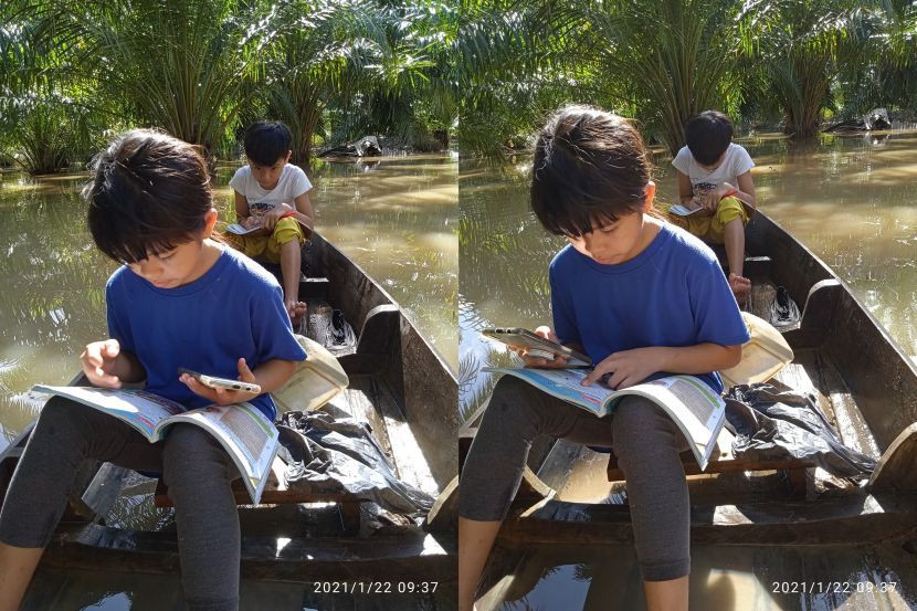 Menerusi foto yang dikongsi, Mazlieyana Razieyla Mat Lajim, 12, bersama adiknya Muhd Rahiemiey, 10, di Beufort, Sabah terpaksa melalui Pengajaran dan Pembelajaran di Rumah (PdPR) di atas sampan.